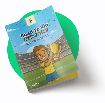 Each book teaches five iconic skills per block, inspired by legendary Brazilian players. Your child learns the moves in class, practises at home using QR-code video tutorials, and tracks progress inside this book.